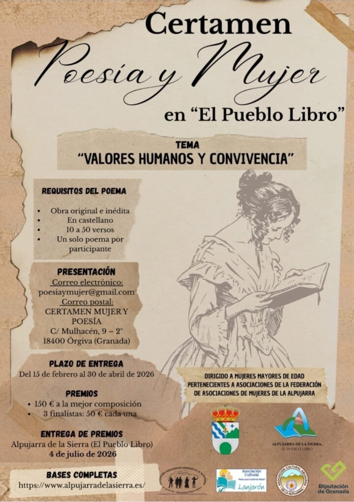 El Ayuntamiento de Alpujarra de la Sierra (El Pueblo Libro), junto a la Asociación Cultural Poeta Juan Gutiérrez Padial y la Asociación Cultural Abuxarra, convoca el certamen “Poesía y Mujer en El Pueblo Libro”, con el objetivo de fomentar la creación cultural en el colectivo de mujeres de La Alpujarra.